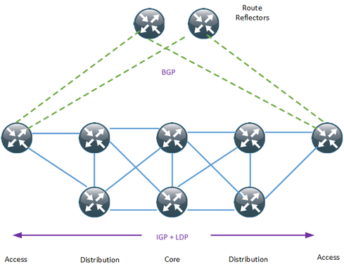 Multi Protocol Label Switching (MPLS) is the main forwarding paradigm in all the major service providers (SP) networks. MPLS, as the name implies, uses labels to forward the packets, thus providing the major advantage of a Border Gateway Protocol (BGP)-free core. To assign these labels, the most commonly used protocol is the Label Distribution Protocol (LDP). A typical provider network can then look like the diagram below.