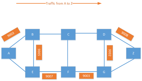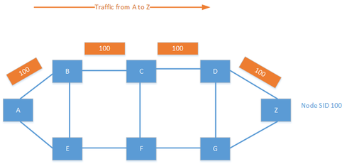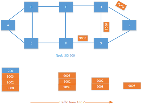 It is also possible to combine the node SID and adjacency SID to create a custom traffic policy. Labels are specified in a label stack, which may include several labels. By combining labels, you can create policies such as, "Send the traffic to F; I don''t care how you get there. From F, go to G, then to D and then finally to Z." This creates endless possibilities for traffic engineering in the provider network.
